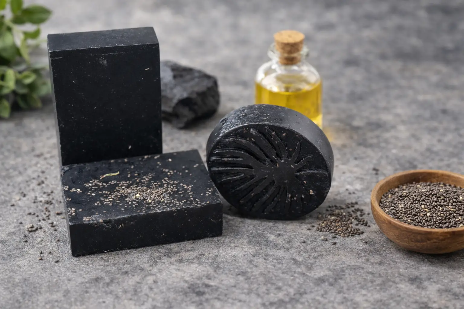 Jojoba soap base, activated charcoal, vitamin E, Chia Seed